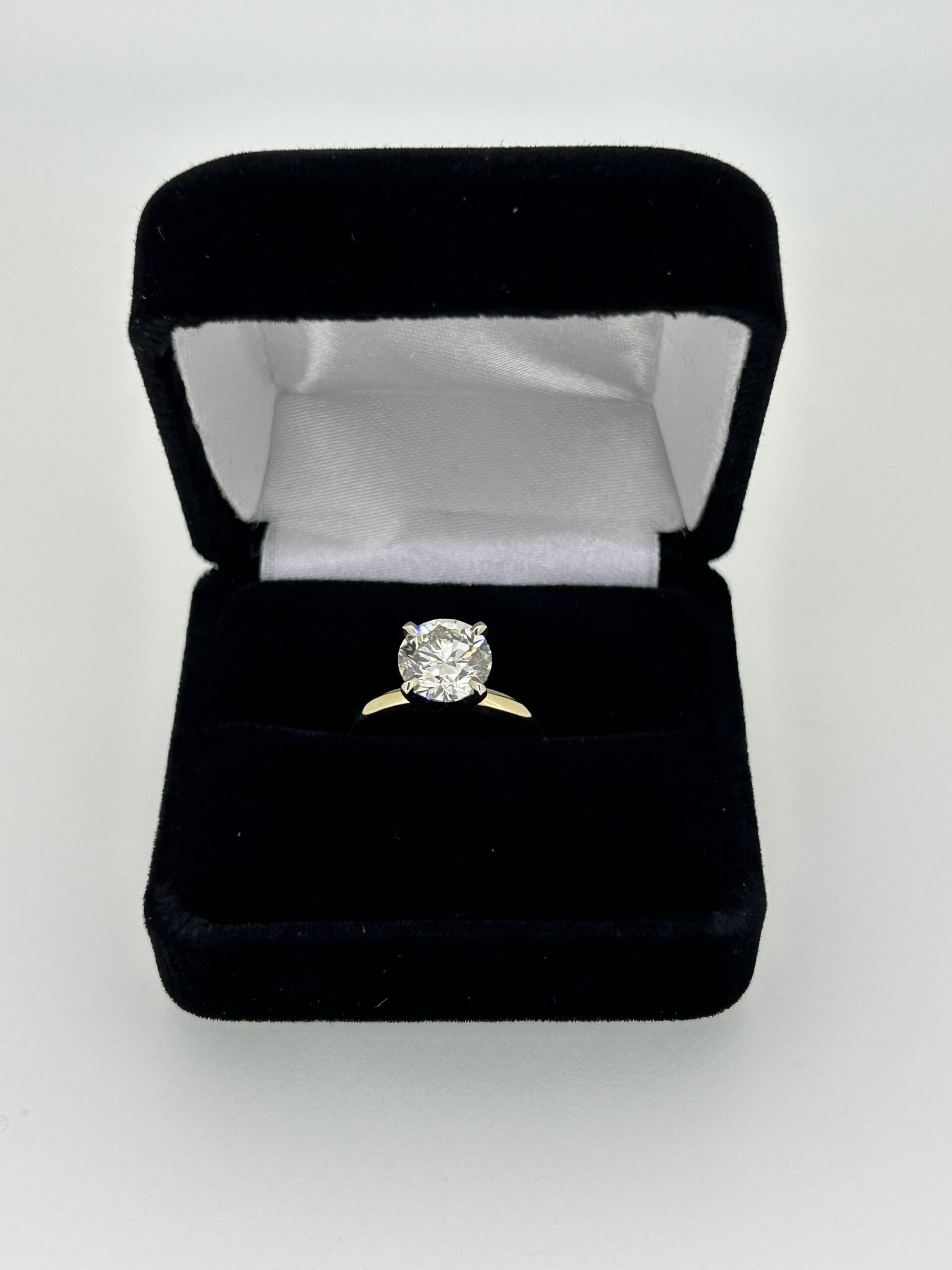 14kt yellow gold diamond engagement ring. The ring is set in a Tiffany style 4 prong head. The round brilliant diamond weighs 2.30ct, its clarity is SI1 and its color is KL. The total approximate weight is 1.95dwt.