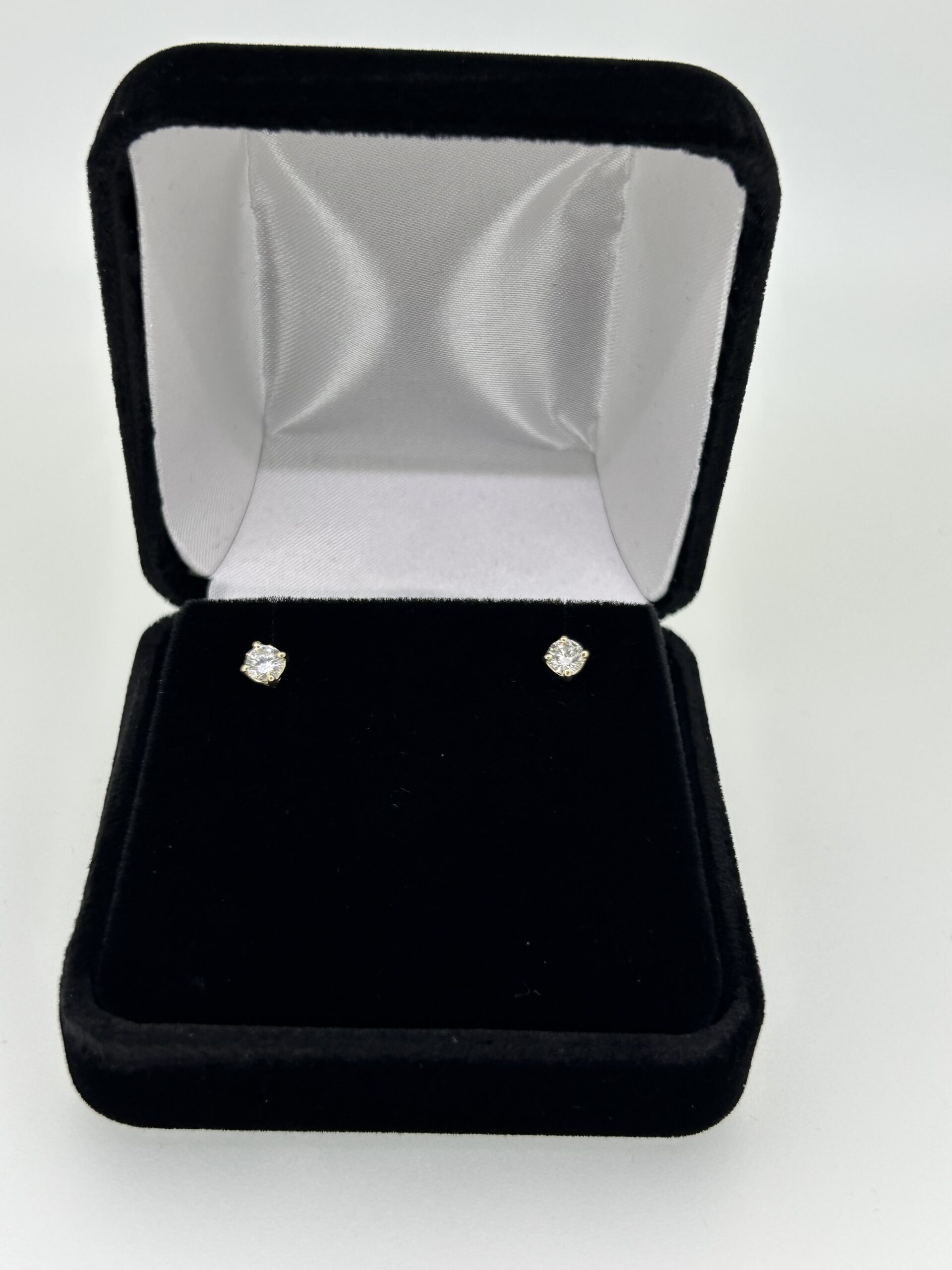 14kt yellow diamond studs. The full cut diamonds are set in four prong wire baskets with regular posts. The diamonds weigh 0.39, the clarities are SI and the colors range H-I. The total weight of the earrings is 0.5dwt.