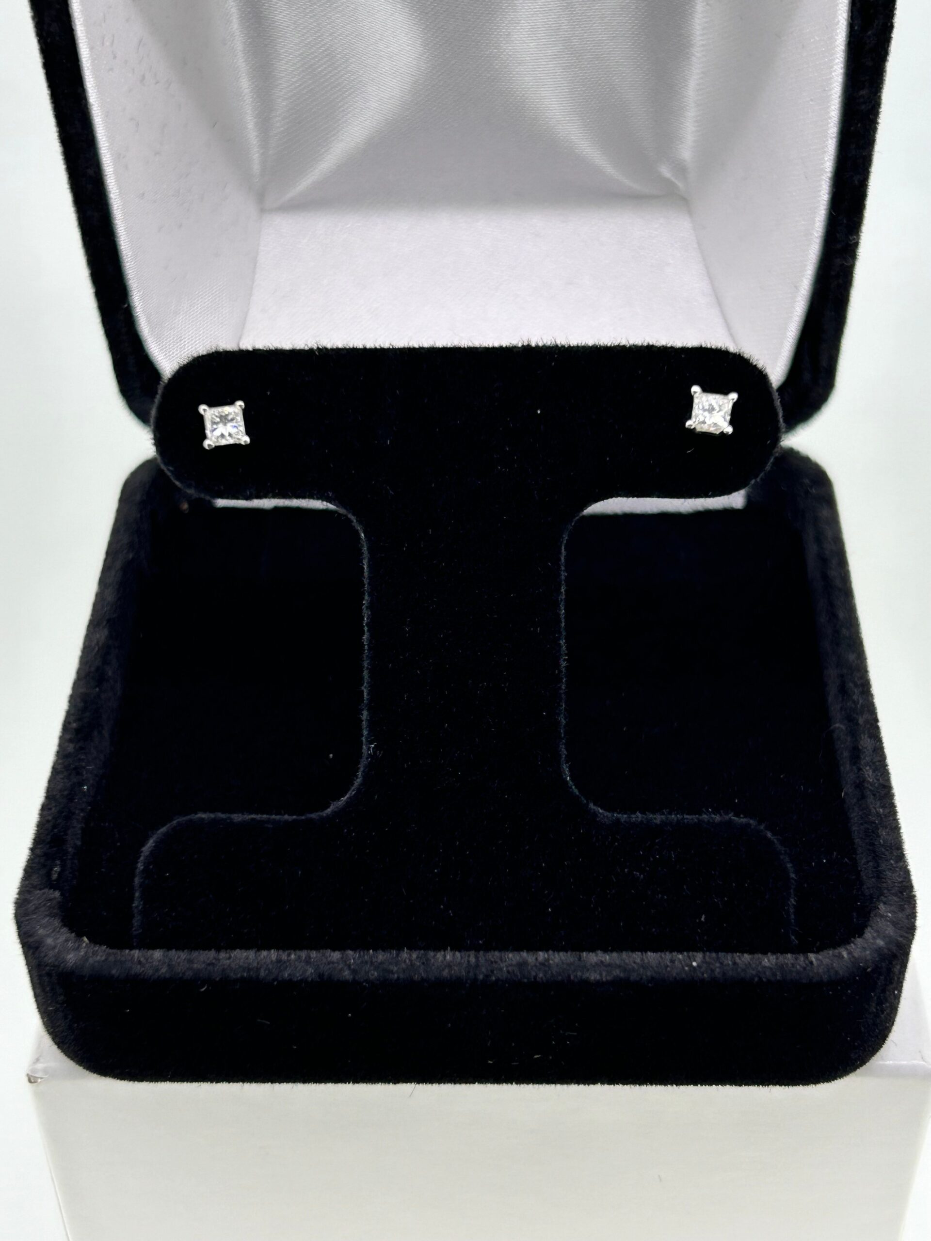 14kt white gold. Two princess cut diamonds in a four prong set weighing approximately 0.34ct. Their clarity is SI2 and their color is G-H with regular posts.